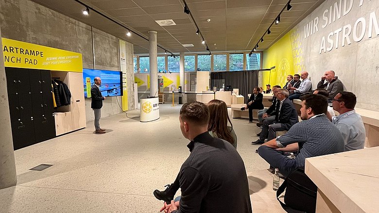 Zwei Experten berichteten in spannenden Vorträgen über Möglichkeiten und Herausforderungen in der Praxis: Markus Heigele von der Alois Müller GmbH aus Schwaben startete mit seinem Vortrag zum Thema Eigenversorgungskonzepte im Unternehmen und stellte dabei die Green Factory, ein nahezu energieautarkes Produktions- und Bürogebäude an der Hauptniederlassung des Unternehmens in Ungerhausen vor. Im Anschluss informierte Stephan Röß, AI Charge Technologies GmbH, über KI Anwendungen für bidirektionales Laden von Elektrofahrzeugen im Zusammenspiel von Nachhaltigkeit und Digitalisierung. Im Anschluss der beiden Vorträge fand eine lebhafte Diskussion mit vielen interessanten Fragestellungen zwischen den Vortragenden und den Teilnehmenden statt. Den Abschluss der Veranstaltung bildete die Führung durch das RUBINA mit Erklärungen zur modernen Bauweise des Gebäudes nach neuesten Gebäude- und Energiestandards sowie die Vorstellung des Energie-Bildungszentrums um:welt.