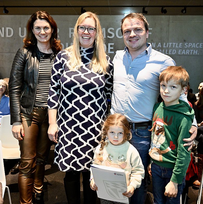 Landrätin Tanja Schweiger mit der Familie Würzinger, die in der Kategorie "Klimafreundliche Gebäude" ausgezeichnet wurde. Foto: HC Wagner