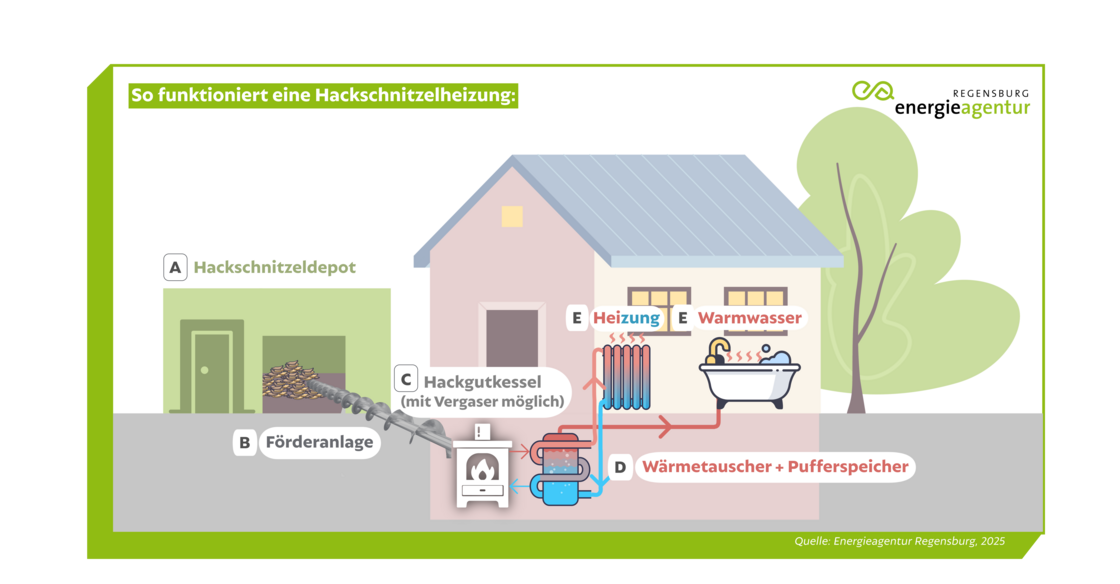 Für Hackschnitzel wird ein größerer, gut zugänglicher Lagerraum benötigt (A). Die Hackschnitzel werden aus diesem Lager über eine Förderanlage (B) zum Hackgut-/Brennkessel transportiert (C). Die entstehende Hitze wird über einen Wärmetauscher (D) an das Heizungswasser (E) oder Warmwasser (E) abgegeben. Das erwärmte Wasser wird zudem in einen Pufferspeicher (D) geleitet, um Wärme zu speichern und Schwankungen auszugleichen.